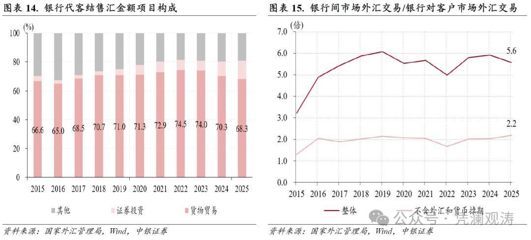 第一,货品买卖主导的境表里汇市集环境下,容易出现买卖顺差与东谈主民币增值预期的自我强化、自我闭幕。2025年我国银行代客涉出门入中货品买卖占比为42.7%,较2015年下降24.4个百分点,但银行代客结售汇中货品买卖占比不降反升1.7个百分点至68.3%(见图表14)。在银行间外汇市辘集,即期来往阐扬价钱酿成作用,远期和期权则阐扬价钱发现作用。剔以外汇和货币掉期来往后,银行间市集外汇来往限制基本是银行对客户市集来往限制的2倍傍边,远小于举座市集5~6倍的倍差,况兼二者比重保握基本踏实(见图表15)。这意味着,银行间外汇市集结构与银行对客户市集基本匹配(也称客盘驱动),均由货品买卖主导。