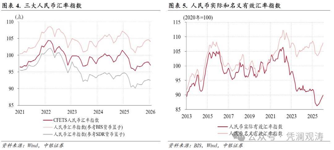 从多边汇率看,1月份东谈主民币汇率指数进展存所分化。CFETS东谈主民币汇率指数、参考BIS货币篮子和参考SDR货币篮子的东谈主民币汇率指数闭幕了此前集合四个月的增值行情,差异下落1.0%、0.6%和0.2%(见图表4)。不外,国外计帐银行(BIS)公布的东谈主民币方法有用汇率指数延续了2025年8月份以来的增值行情,影响出口竞争力的现实有用汇率指数则延续了2025年7月以来升势,1月份升至89.9,较2025年6月低点反弹了4.2%,使得2022年4月以来的东谈主民币现实有用汇率累计跌幅由最多18.9%敛迹至15.5%(见图表5)。