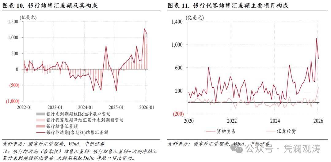 第二,境表里汇供求失衡现象加重。如前所述,银行结售汇顺差在2025年12月创下历史新高后,2026年1月再度录得历史次高,顺差限制集合两个月朝上千亿。2025年3月至2026年1月,银行结售汇累计顺差5131亿好意思元,仅用了11个月的时候就朝上了此前20个月(2023年7月至2025年2月)积蓄的银行结售汇逆差4061亿好意思元(见图表10)。