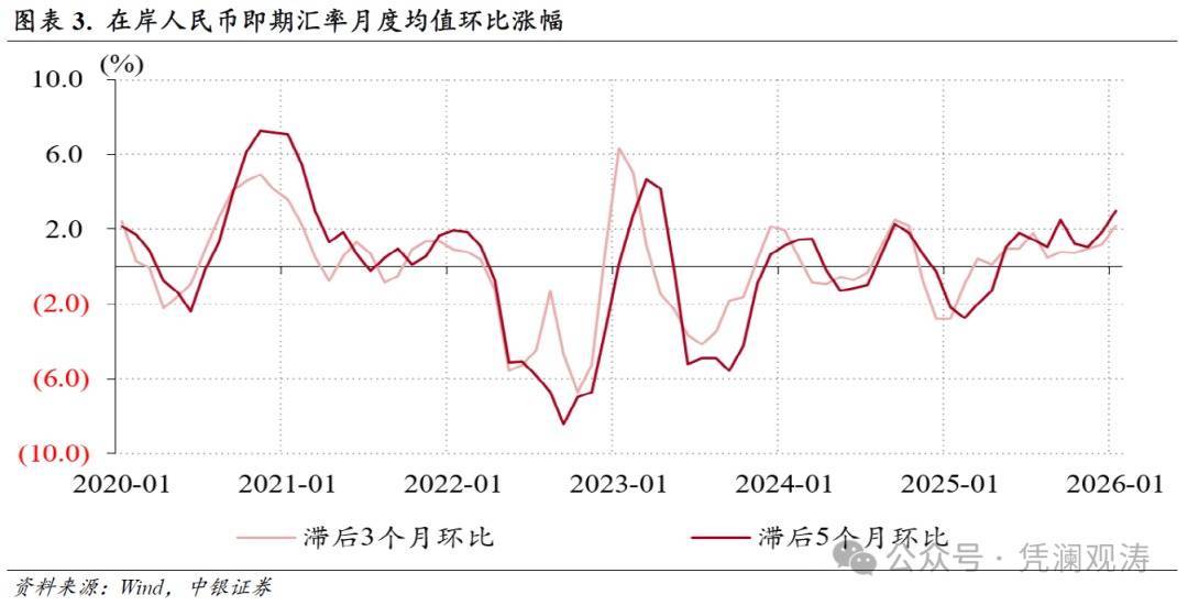 从双边汇率看,1月份,在岸即期汇率均值为6.9675,是集合第五个月增值,况兼是2023年6月以来初度升破7.0。当月,滞后3个月和滞后5个月环比的即期汇率均值涨幅差异由上月1.2%、1.8%扩大至2.2%、3.0%,前者涨幅创2024年11月以来新高,后者涨幅更是创下2023年5月以来新高。这意味着,在不进行汇率风险对冲情况下,按照五个月的收款账期诡计,1月份出口企业濒临的汇兑死亡是3.0%,加大企业财务压力(见图表3)。