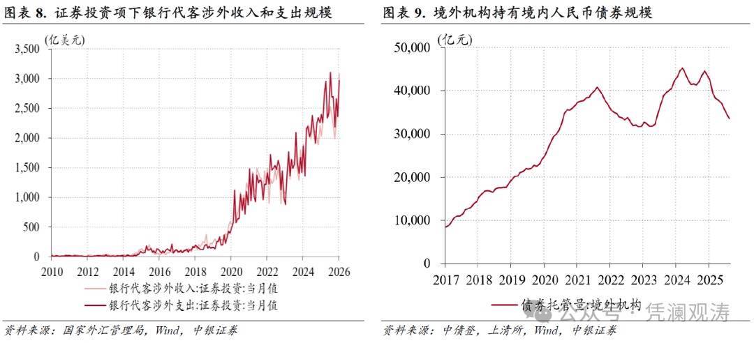 开年以来,跟着外资机构集体看多中国股票钞票[2],外资流入中国股市速率加速。证实摩根士丹利统计,1月份好意思欧基金流入中国股票市集限制达86亿好意思元,创2024年10月以来新高,其中主动型基金时隔近三年头度转为净流入,限制约12亿好意思元,被迫型基金净流入限制由上月44亿增至74亿好意思元[3]。然则,同期中债收益率下行和好意思元对在岸东谈主民币掉期点上行导致东谈主民币债券蛊惑力连吸收缩,境外机构境内东谈主民币债券握有量则是集合第九个月减少,降幅为1077亿元,集合第三个月降幅过千亿(见图表9)。