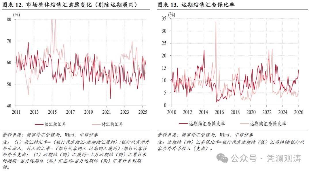 第三,市集结汇意愿增强、购汇动机收缩。2025年12月-2026年1月,收汇结汇率、付汇购汇率均值差异为60.0%、55.1%,较2025年3月至11月本领均值差异高潮5.4个百分点、回落3.6个百分点,较2023年7月至2025年2月本领均值差异高潮6.7个百分点、回落8.1个百分点(见图表12)。