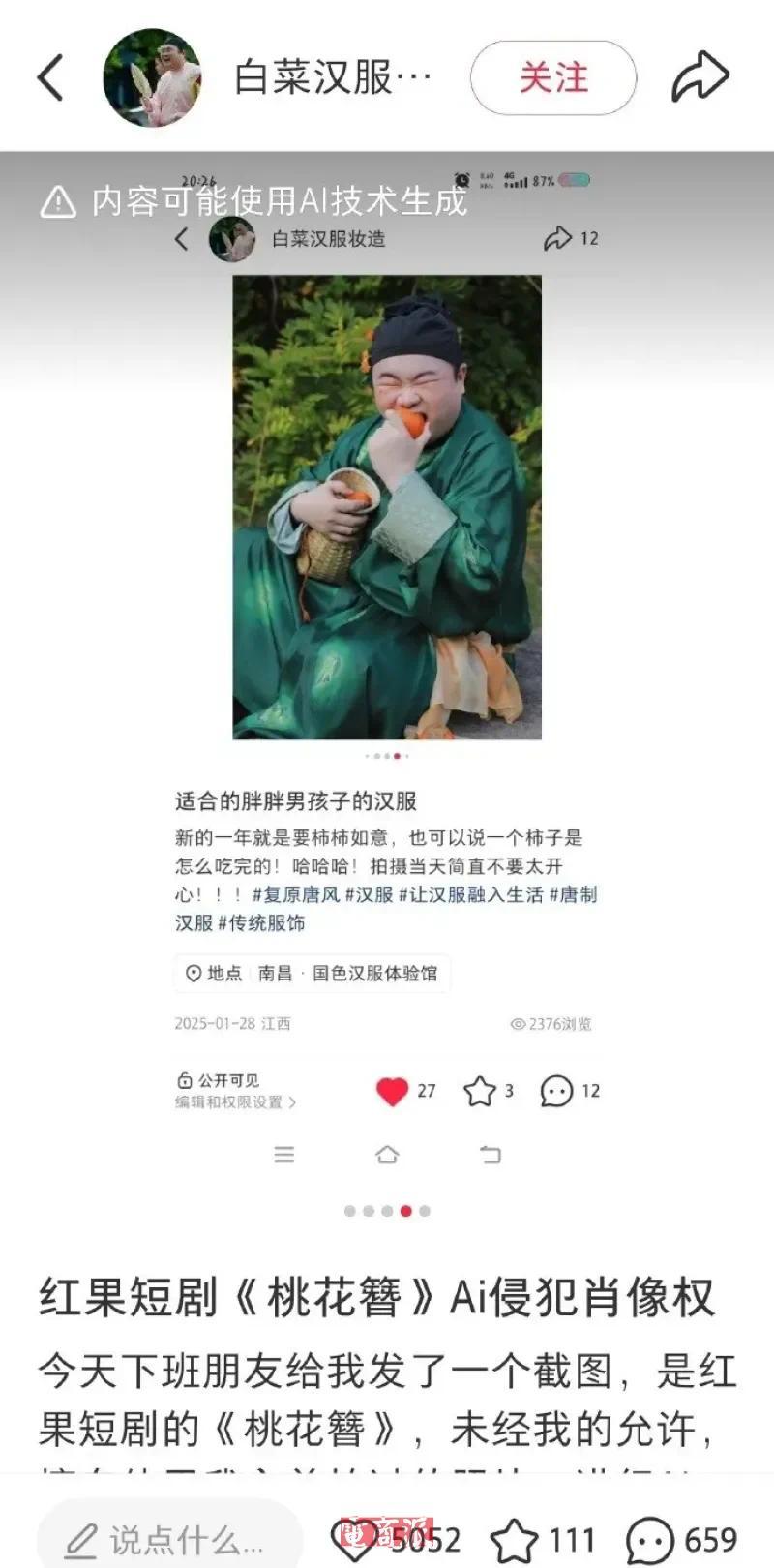 而他被盗用的相片,拍摄于2025年1月,那时正好柿子老练季,他悉心收拾了妆容、筹算了造型,初志仅仅在小红书上共享我方的汉服日常。