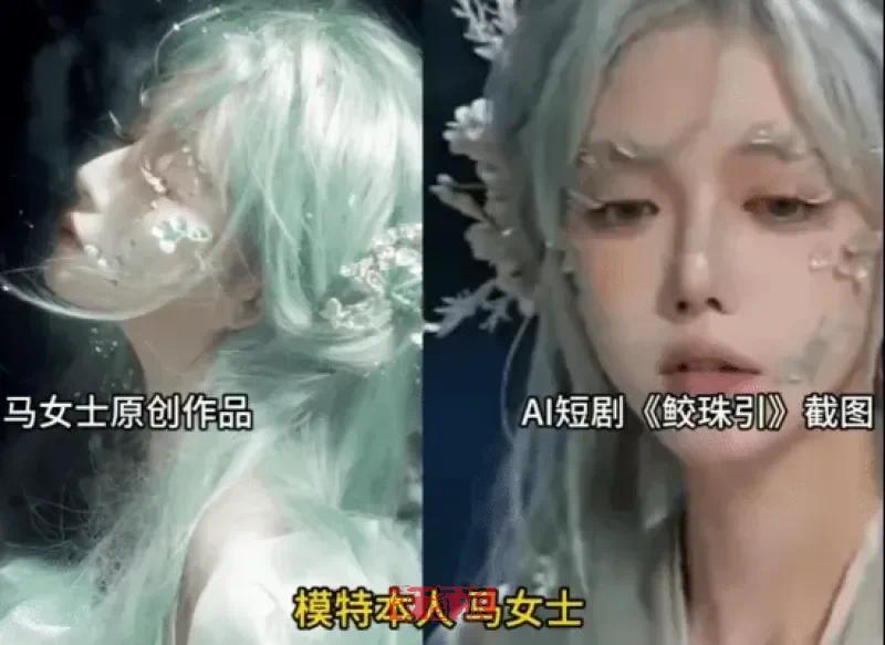 就在不久前,一位名为马女士的模特也公开维权。她手工制作的衣饰、头饰遭AI短剧《鲛珠引》盗用,播放量超2300万,她本东谈主全程不知情。